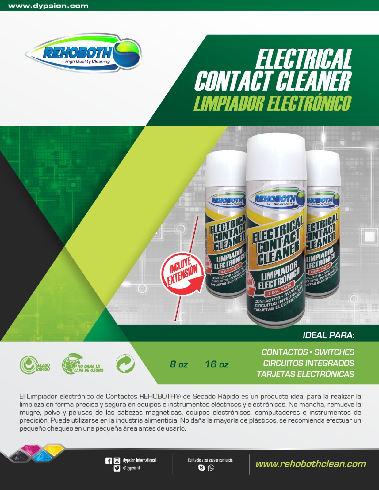 El Limpiador electrónico de Contactos REHOBOTH® de Secado Rápido es un producto ideal para la realizar la limpieza en forma precisa y segura en equipos e instrumentos eléctricos y electrónicos. No mancha, remueve la mugre, polvo y pelusas de las cabezas magnéticas, equipos electrónicos, computadores e instrumentos de precisión. Puede utilizarse en la industria alimenticia. No daña la mayoría de plásticos, se recomienda efectuar un pequeño chequeo en una pequeña área antes de usarlo. INCLUYE EXTENSION PARA APLICACIONES PRECISAS.